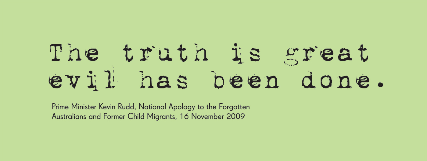 The Australian Government made a National Apology to the Forgotten Australians and former child migrants for the suffering they had experienced in ‘out of home’ care, in November 2009. The year before, the government apologised to the Stolen Generations.
