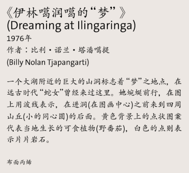 Dreaming at Ilingaringa, 1976A huge cave marks the Dreaming site, near a large lake, to which the Snake Woman travelled in ancestral times. She took a circular path, indicated by the wavy lines, venturing behind the surrounding hills (the small concentric circles), before entering the cave, shown at the centre of the painting. Yellow background dots represent the local food plant (bush tomato) and the white dots indicate patches of rock. |