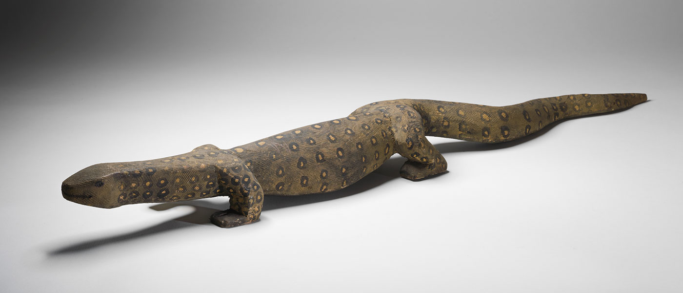 Before the painting movement began in Papunya during the early 1970s, artists such as Clifford Possum Tjapaltjarri, Tim Leura Tjapaltjarri and Billy Stockman Tjapaltjarri had established reputations as carvers of realistic snakes and lizards. This intricately carved perentie lizard shows Tjapaltjarri’s extraordinary woodworking skills.
