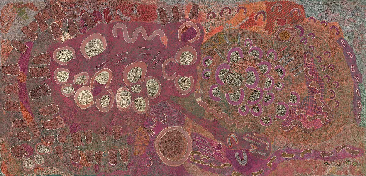 Songlines: Tracking the Seven Sisters showcases five First Nations songlines from Australia’s Western and Central Deserts. It uses over 300 paintings and photographs, objects, song, dance and multimedia to narrate the story of the Seven Sisters and their creation of the continent as they travelled from west to east.