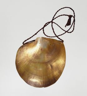 One piece of a two-piece neck ornament consisting of two mussel shells, each with its own neckband. The mother-of-pearl layer of the two shells, smooth on both sides, has an iridescent colour, from whitish-yellow on the inside to white-yellow and reddish-brown on the outside. The shells each have three perforations on the base for securing the neckband. The latter, consisting of twisted coconut fibres with their ends knotted together, is firmly tied on to the perforations with thin coconut fibre threads pulled through the holes. In the object Oz 404 b, now only still secured to two perforations, the suspension thread runs from one perforation to the other in a strikingly twisted manner (similar to a comparable piece in the Herrnhut Collection, Inv. 68671).